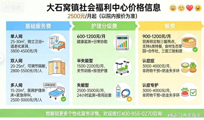 大石窝镇社会福利中心价格:2500元/月起,床位165张(以院内报价为准)(一)床位费:多人间(18-22㎡)配备医用级护理床,人均2500-3500元/月;双人间(22-28㎡)采用可旋转隔断兼顾隐私,人均3000-4500元/月;单人间(28-35㎡)配备智能护理床与毫米波雷达跌倒监测仪,月费4000-5500元。(二)护理费:自理型600-1200元/月侧重健康监测;半失能型1500-2200元/月增设关节活动训练;失能型2500-3800元/月提供24小时生命体征监测;认知症专护3500-5000元/月采用非药物干预疗法。(三)餐费:统一800-1200元/月,由注册营养师定制三餐两点方案,支持糖尿病餐、低嘌呤餐等6类特膳,食材60%源自院内生态农场,执行三查三验制度确保安全。